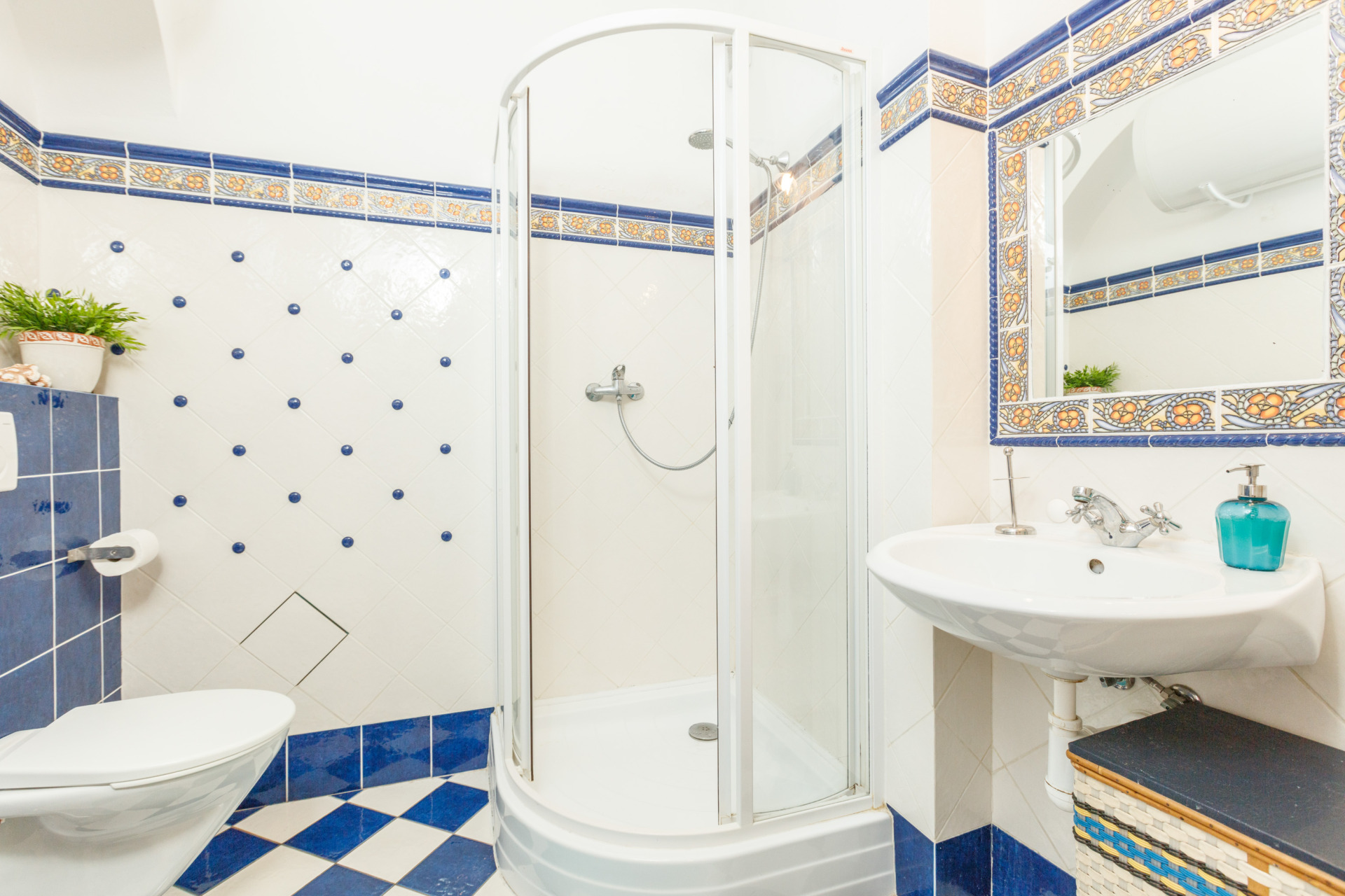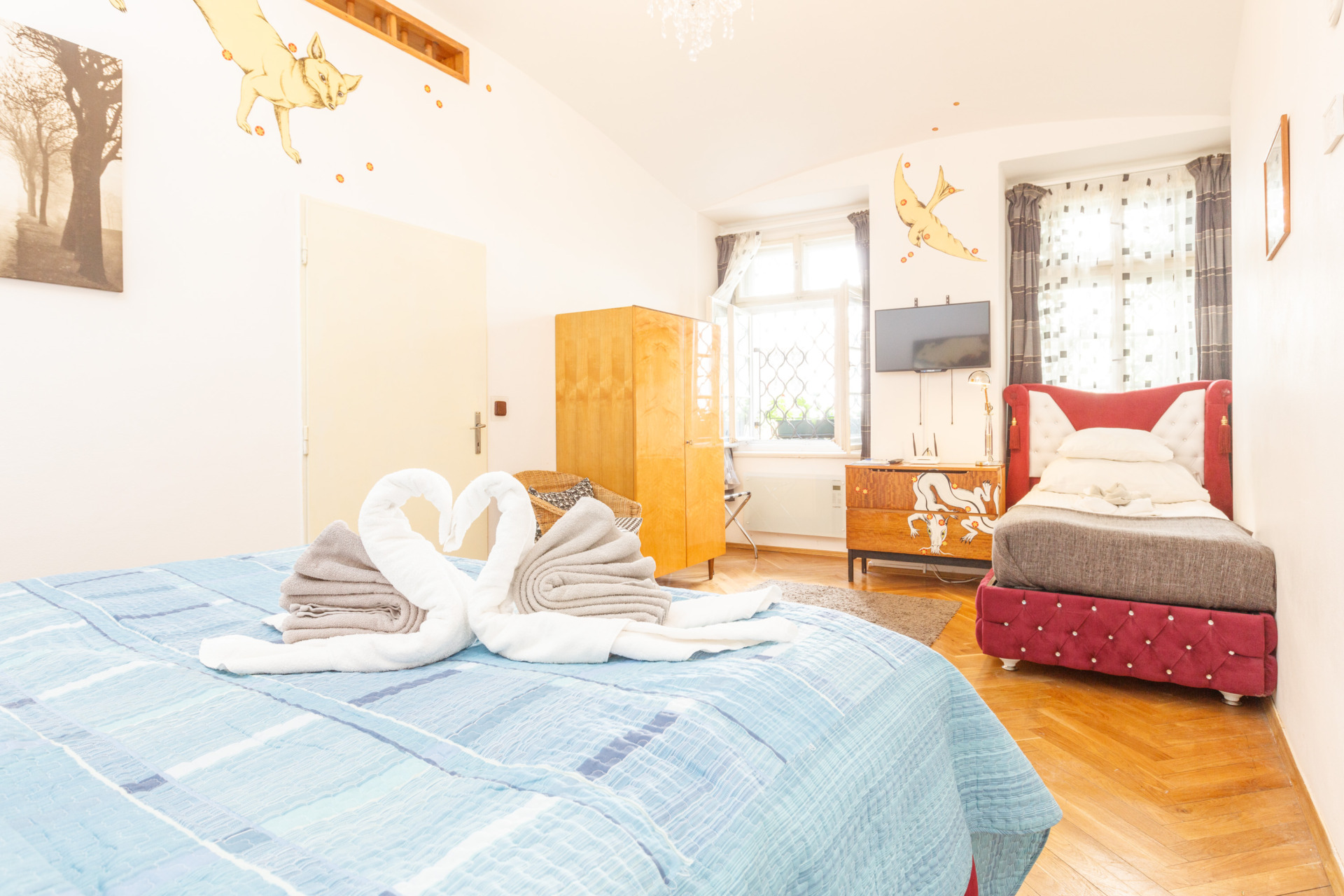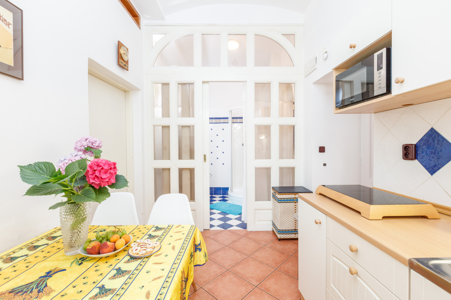 Easily accessible apartment located on the ground floor directly opposite of our café with reception where you are only a few steps away from your favorite freshly brewed coffee. The apartment has one bedroom with a double and a single beds and is, therefore, ideal for both – a couple and a family with a child. It also has a separate kitchen with all the necessary appliances and a dining table. In the bathroom you will find a toilet and shower and bidet.