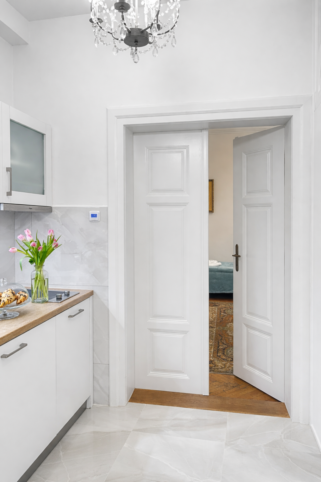 Grapefruit is a spacious apartment with windows directly pointing to the inner garden. It is divided into two bedrooms – one of which has a double bed and the other one has a double bed, sofa bed and dining table, so it is ideal for both: families and groups of friends who have come to Prague to discover its magnificence. The kitchen is fully equipped with a stove, fridge, dishwasher and kettle. The bathroom has a shower and a toilet. The apartment is located on the first floor, reached by stairs, via a shared balcony, where you can enjoy a quiet sitting area overlooking the courtyard and the surrounding historic buildings.